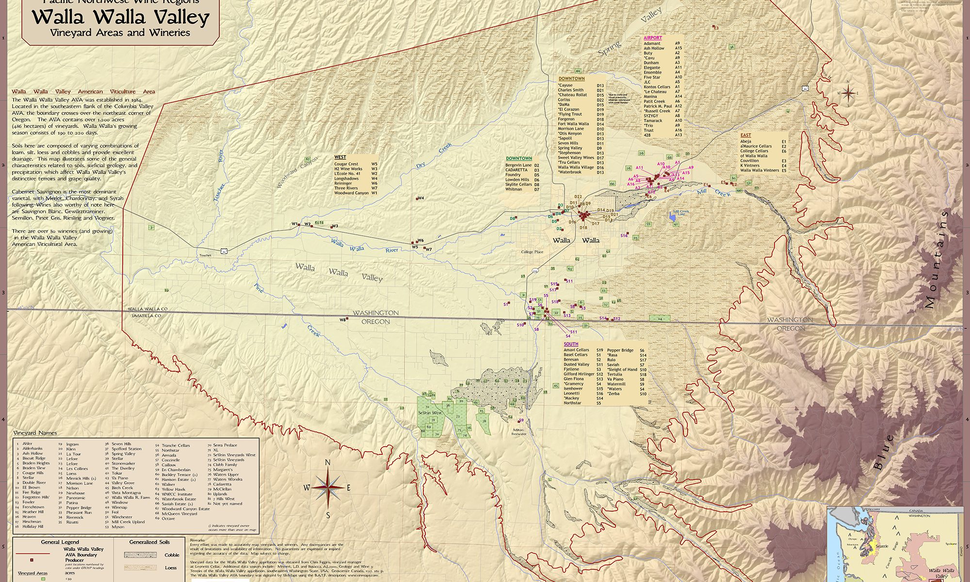 Most of the soil around there is wind-deposited loess or silt. Silt retains water and heat, so it helps protect the roots from frost, but it can be hard to grow deep-rooted vines. These soils add to the highly aromatic and smooth-tannin profile of Walla Walla wines. Rolling mountains on the outskirts of the Valley are prime spots for growing vines. Many of the vineyards on the Oregon side are filled with large pebbles that surround the vines, radiating heat throughout the night which helps increase the vines growth.